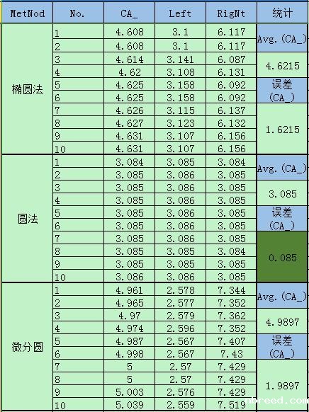 在3° 标样测试中,SDC200S的各个测试方法的测试数据: