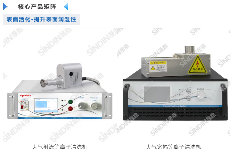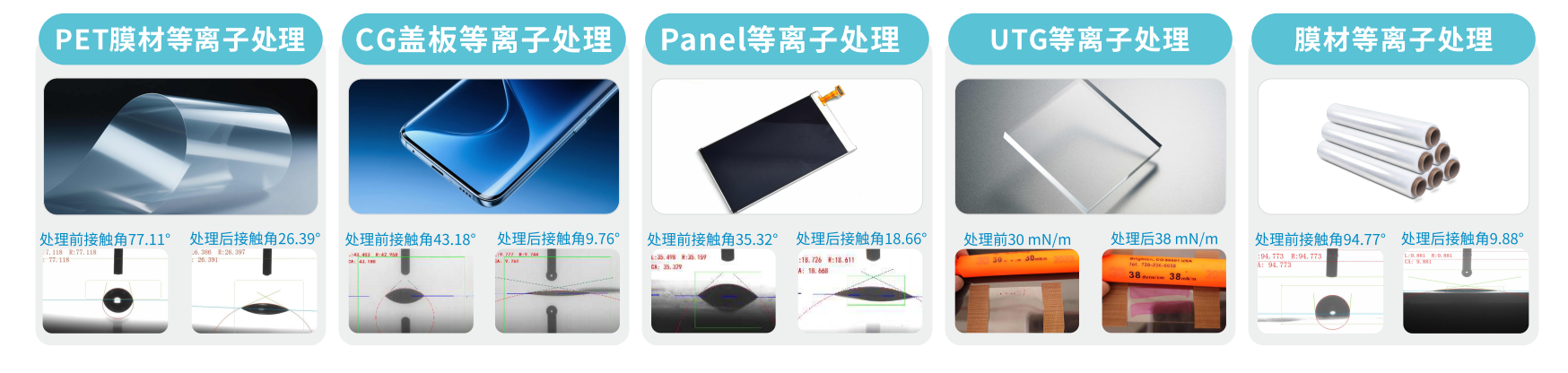 等离子可用于PET膜材、Panel、UTG、CG盖板等材料表面预处理,提高材料表面润湿性,改善界面结合力,从而提升后续贴合、