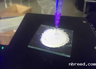使用座滴法的具体操作:我们将粉末材料用两块夹片压平,如下图(广西大学贝壳粉体材料)然后进行常规接触角测量即可(注:如果出现很快被完全润湿的情况 请确定粉末是否压紧。如果是属于吸水材料,使用滤泡法可测得该粉体的接触角。