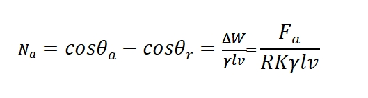 其中指的是黏附力,R固体接触面的半径,K是比例常数(一般取1),无量纲黏附数可以被定义为黏附力与毛细力之比